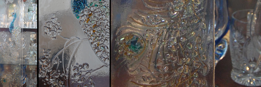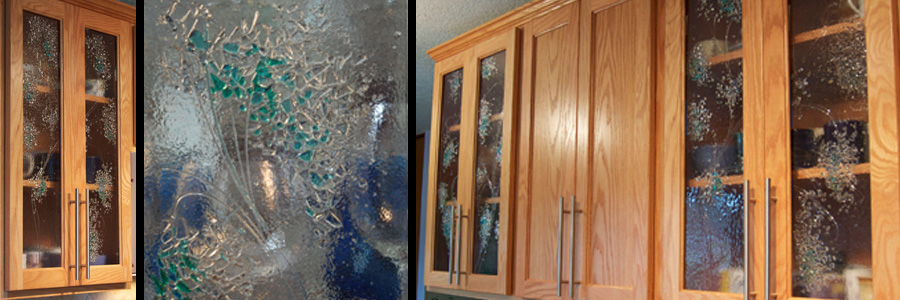 Two years ago while remodeling my own kitchen, I created original glass inserts for my kitchen cabinets. The texture of the glass panels obscures any objects inside of the cabinets, and the light hitting the panels illuminates the entire kitchen. The cabinets glow brightly in both natural and artificial light. I loved the result, and was inspired to share my discovery by creating original glass for all types of kitchen cabinets. I have found that fused glass allows for endless possibilities, much like the traditional stained glass and sandblasted glass techniques I have worked with in the past.